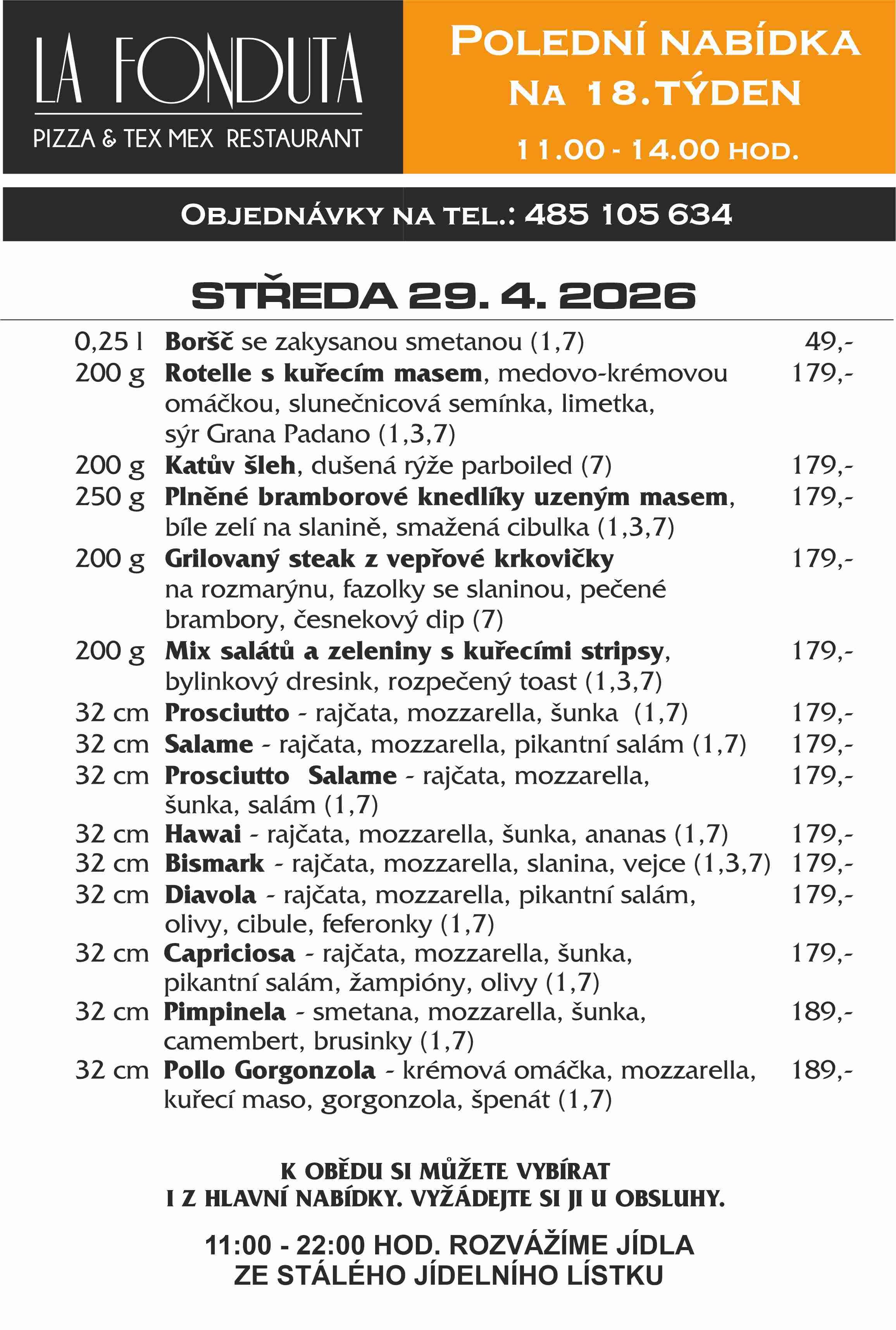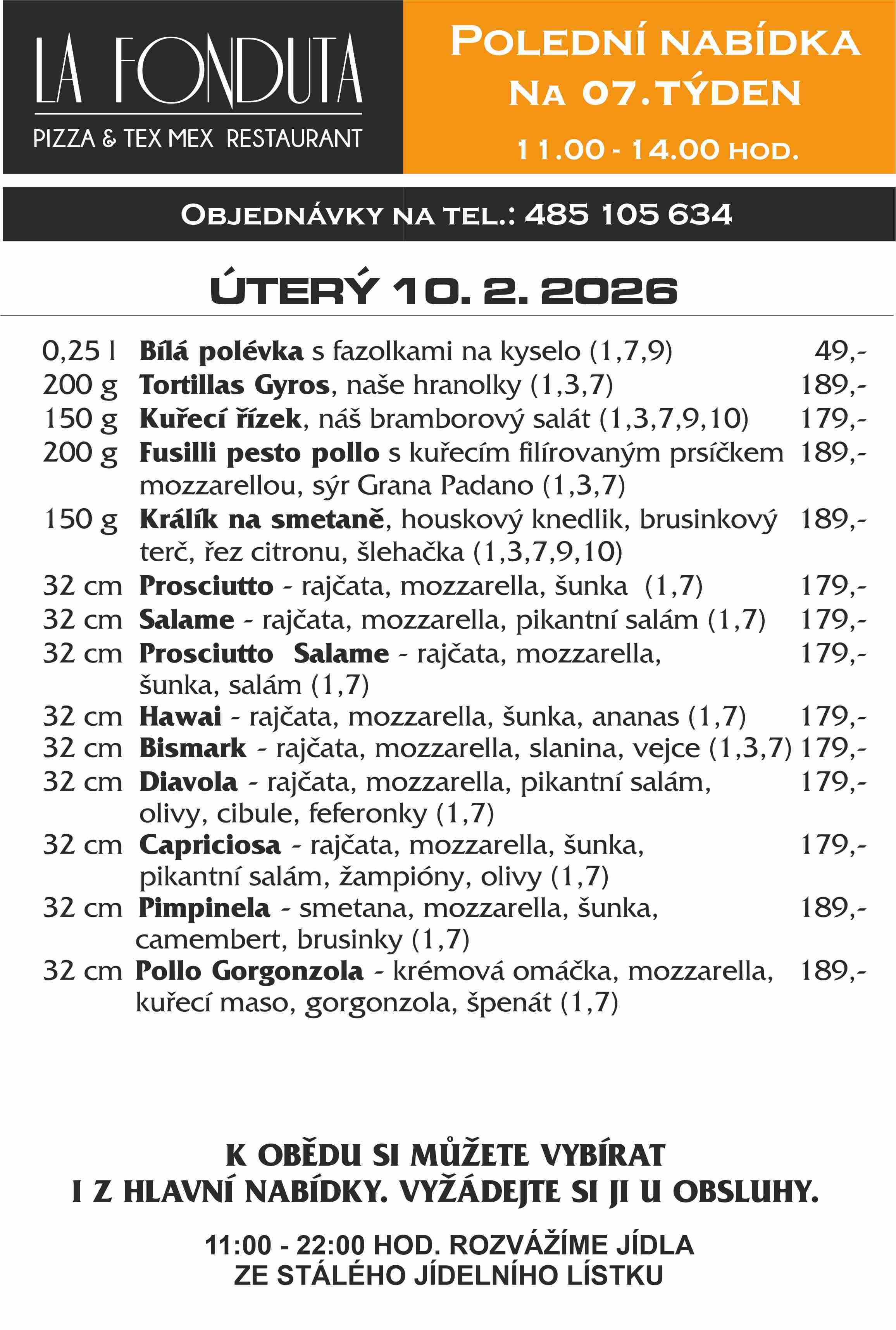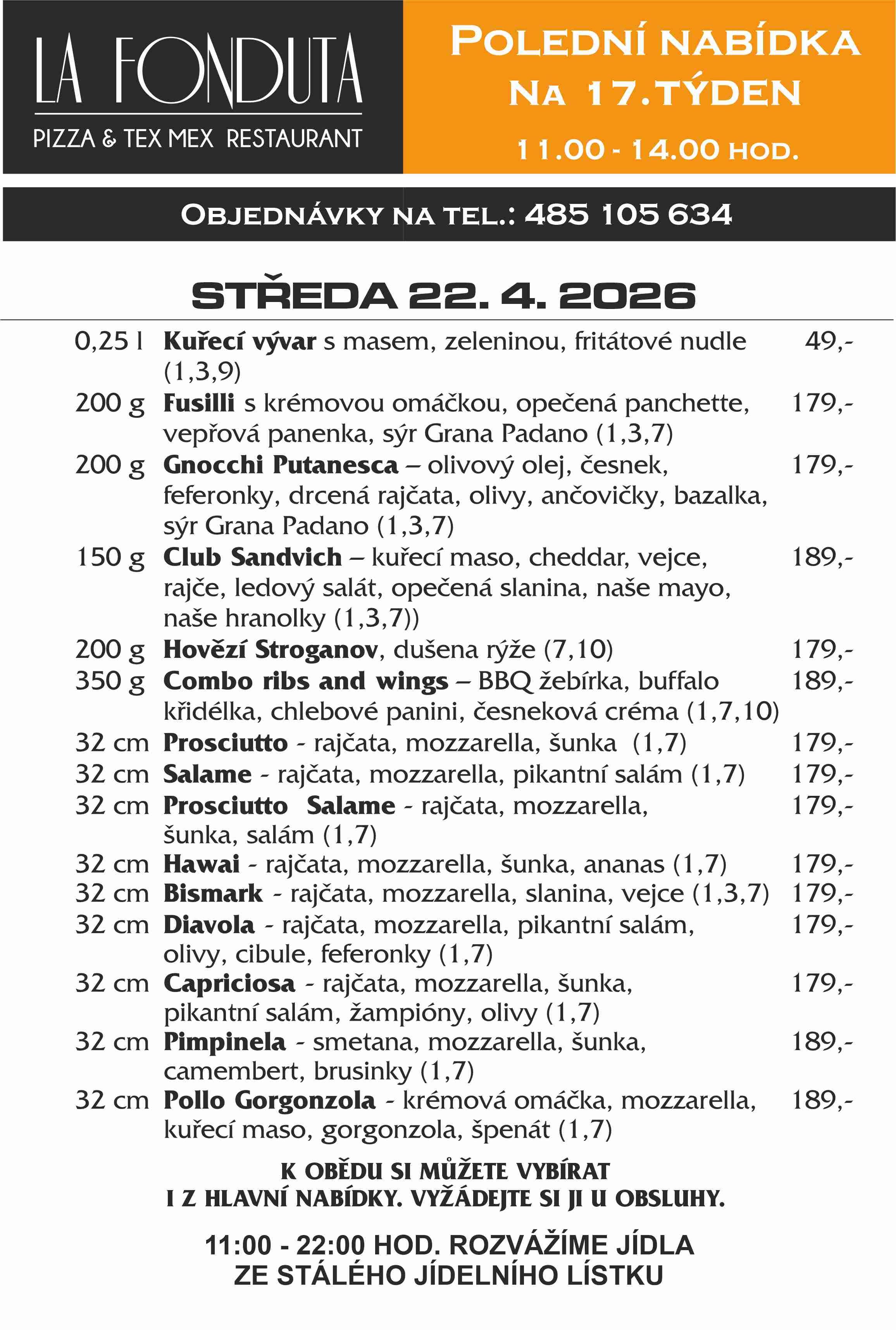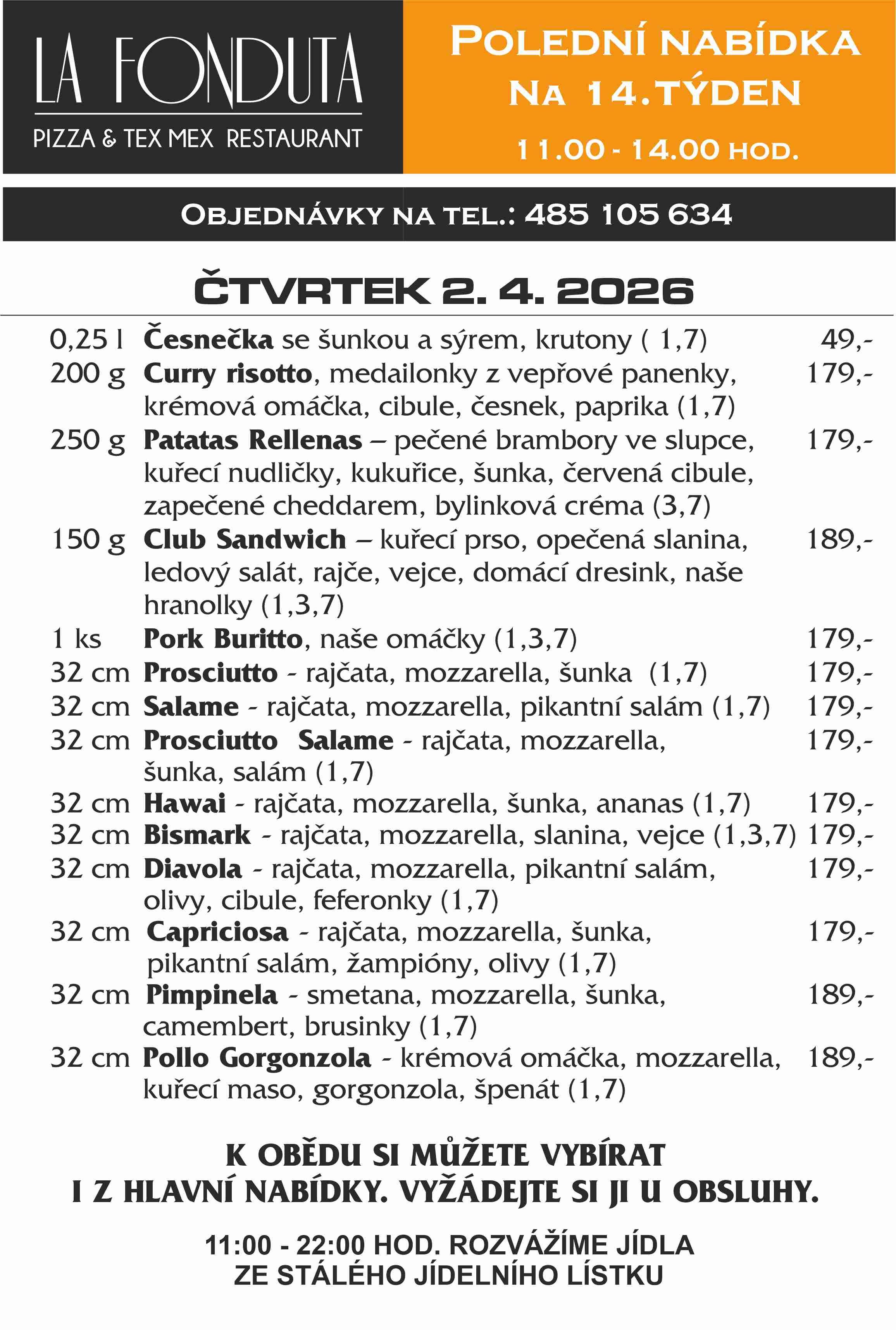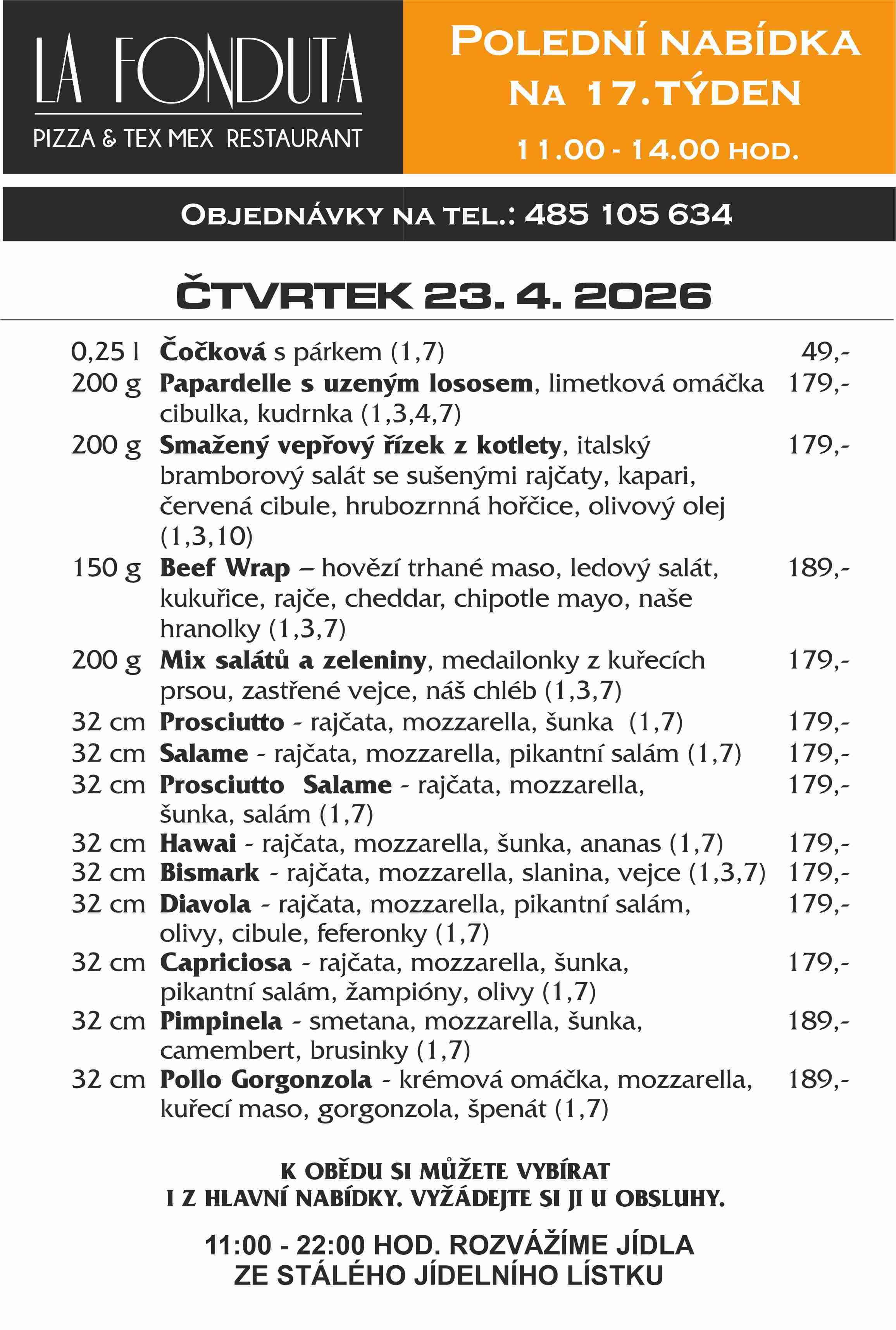 Doba oběda přináší polední nabídku, kde můžete ochutnat jídla z české, italské ale třeba i pokrmy mexické, španělské a americké kuchyně.