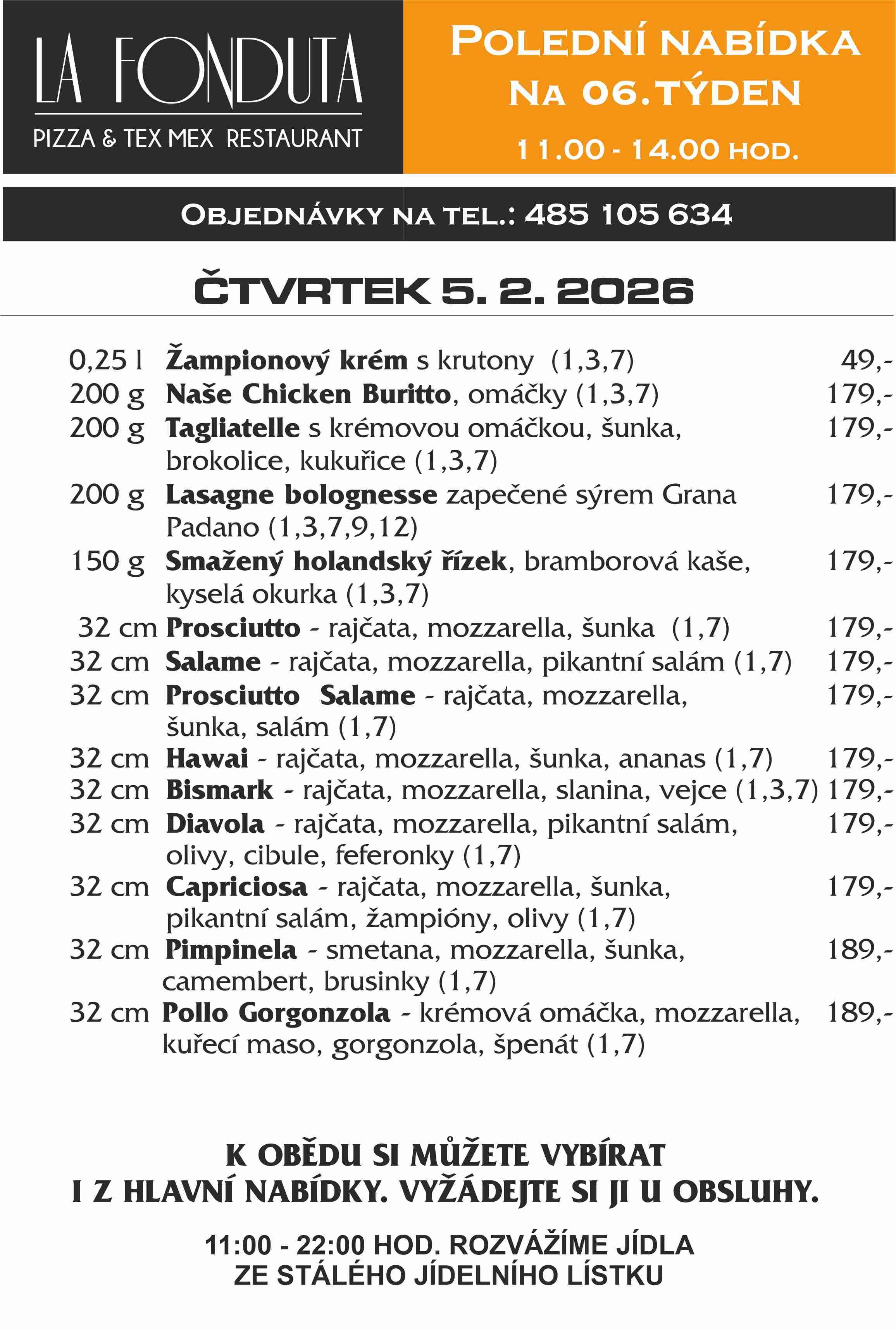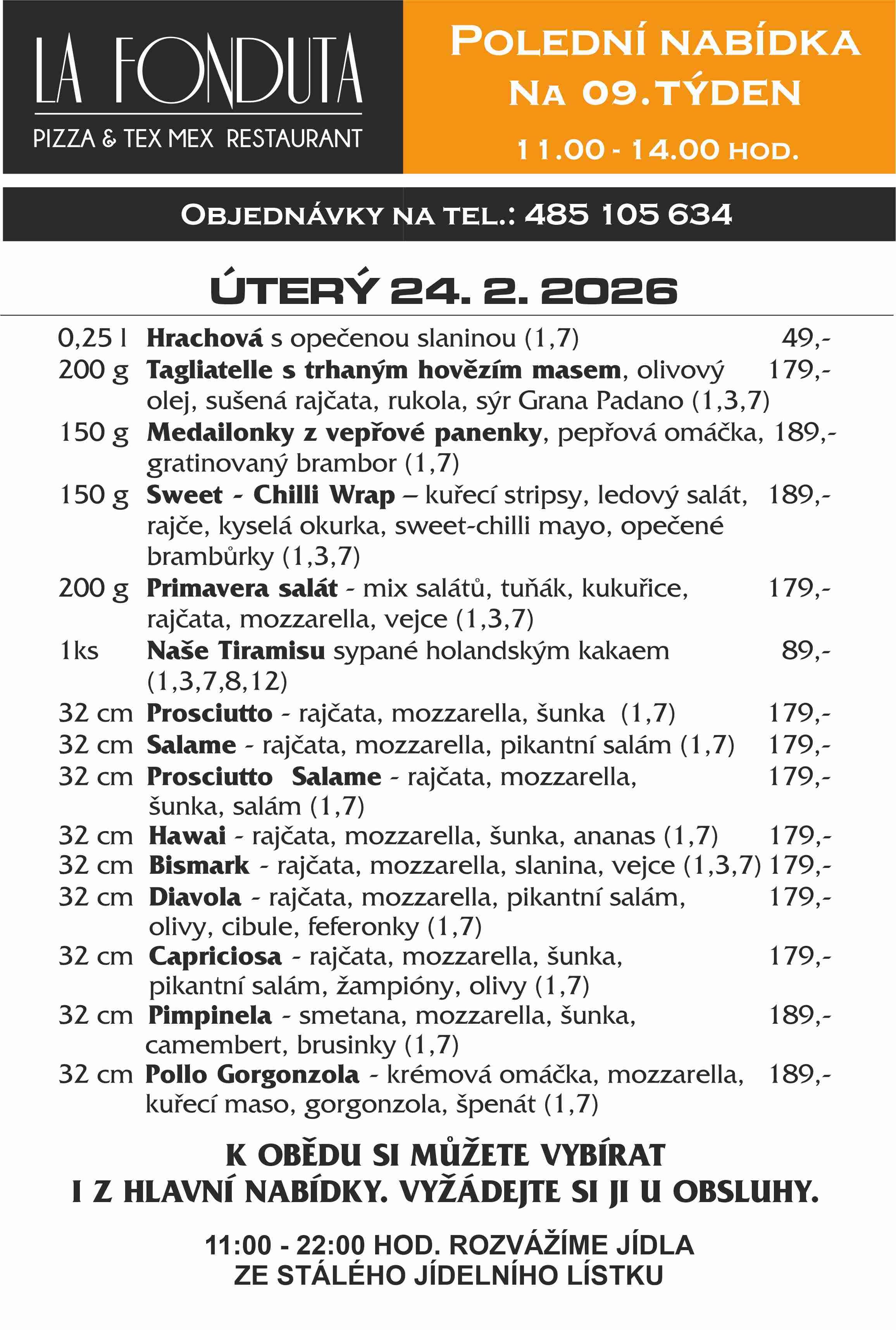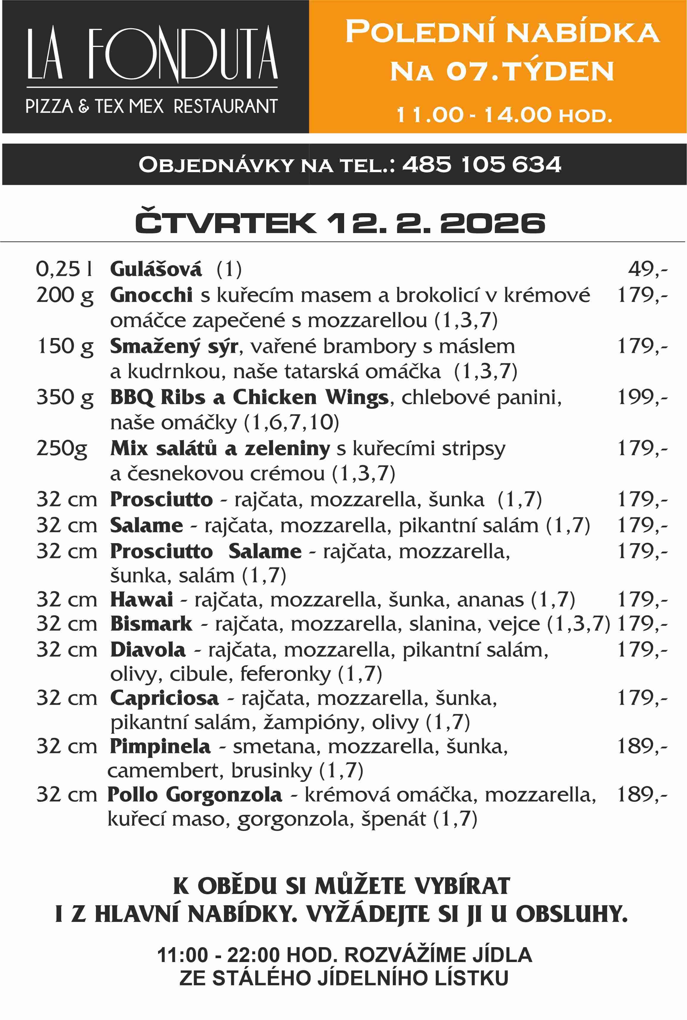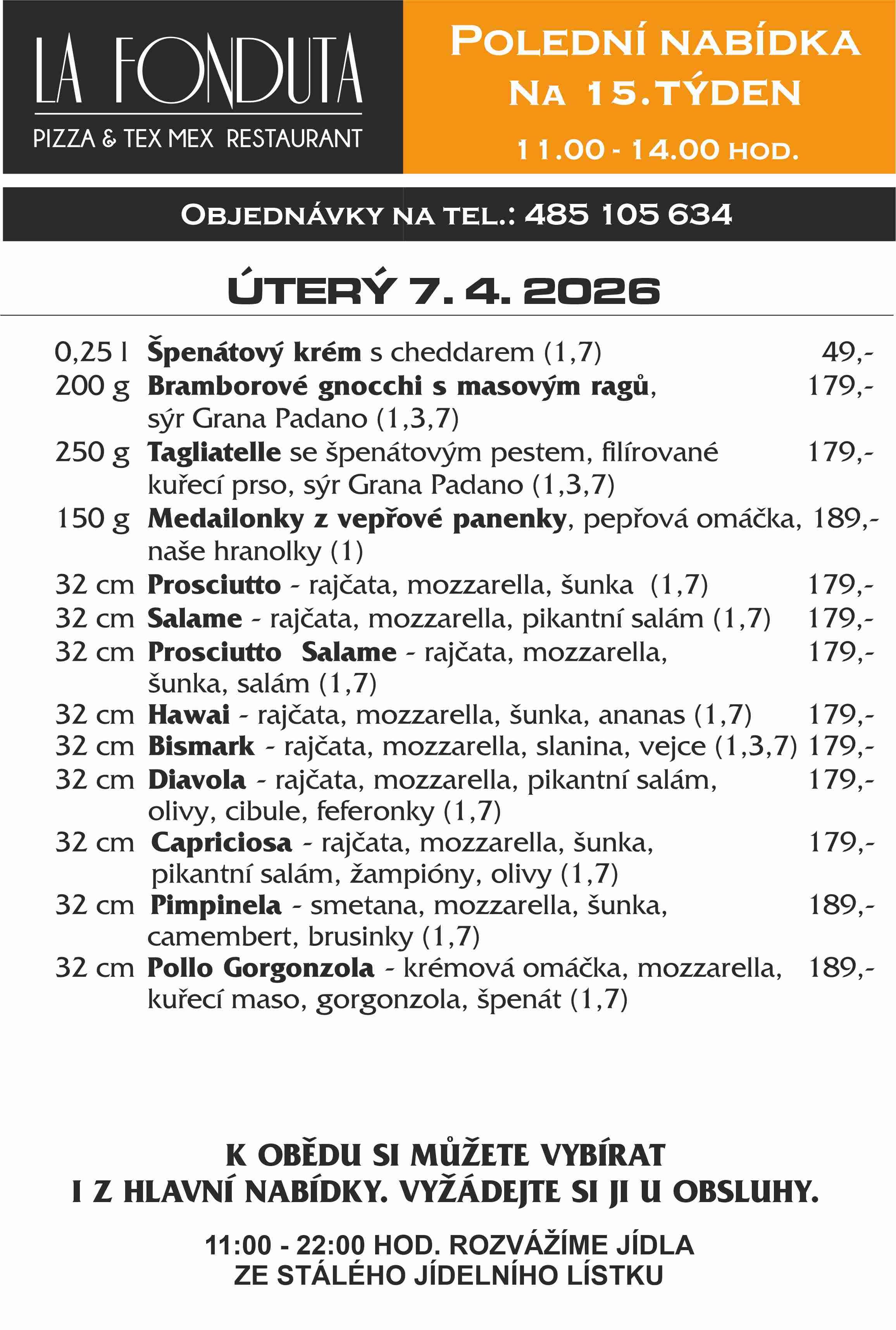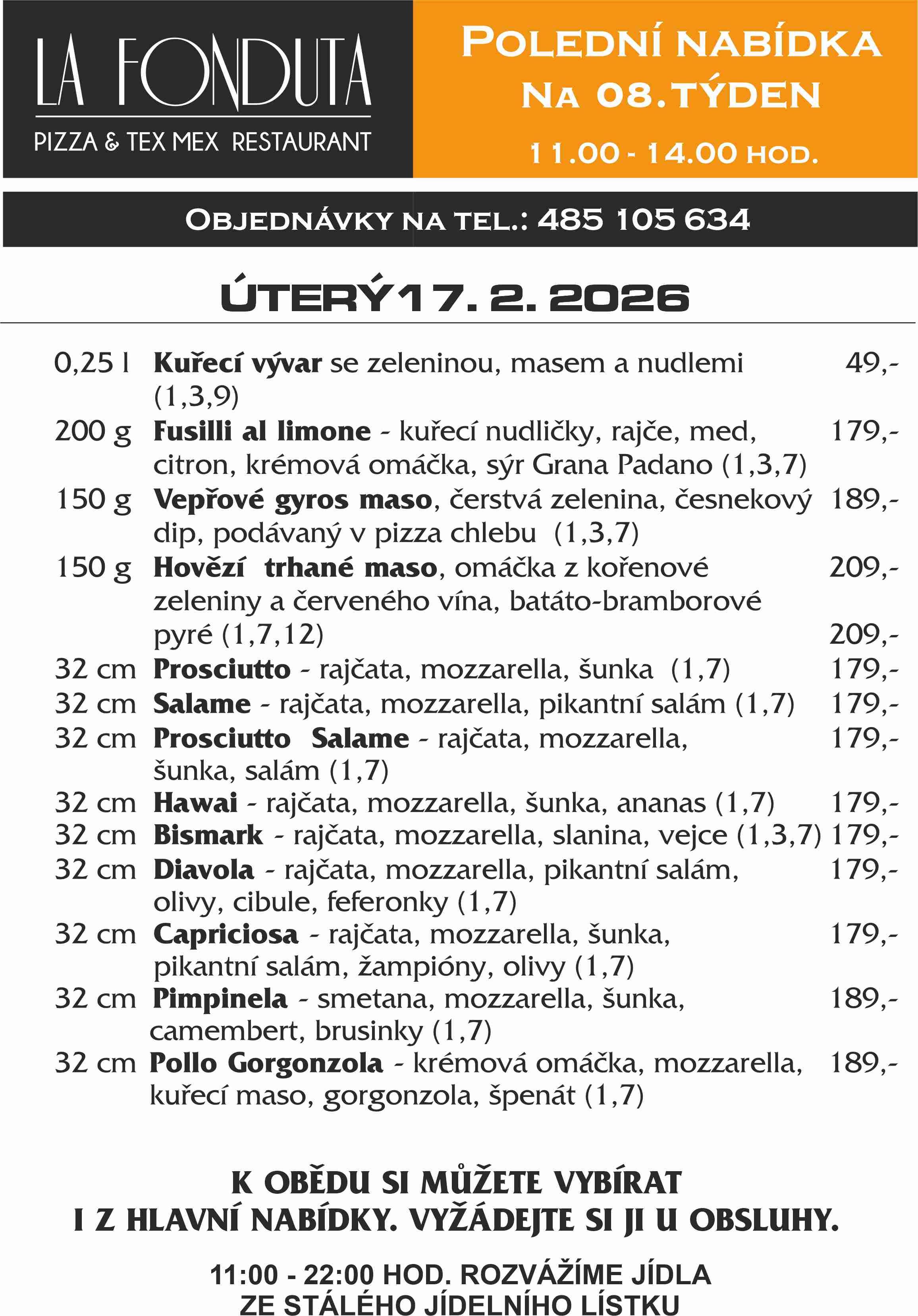 Doba oběda přináší polední nabídku, kde můžete ochutnat jídla z české, italské ale třeba i pokrmy mexické, španělské a americké kuchyně.