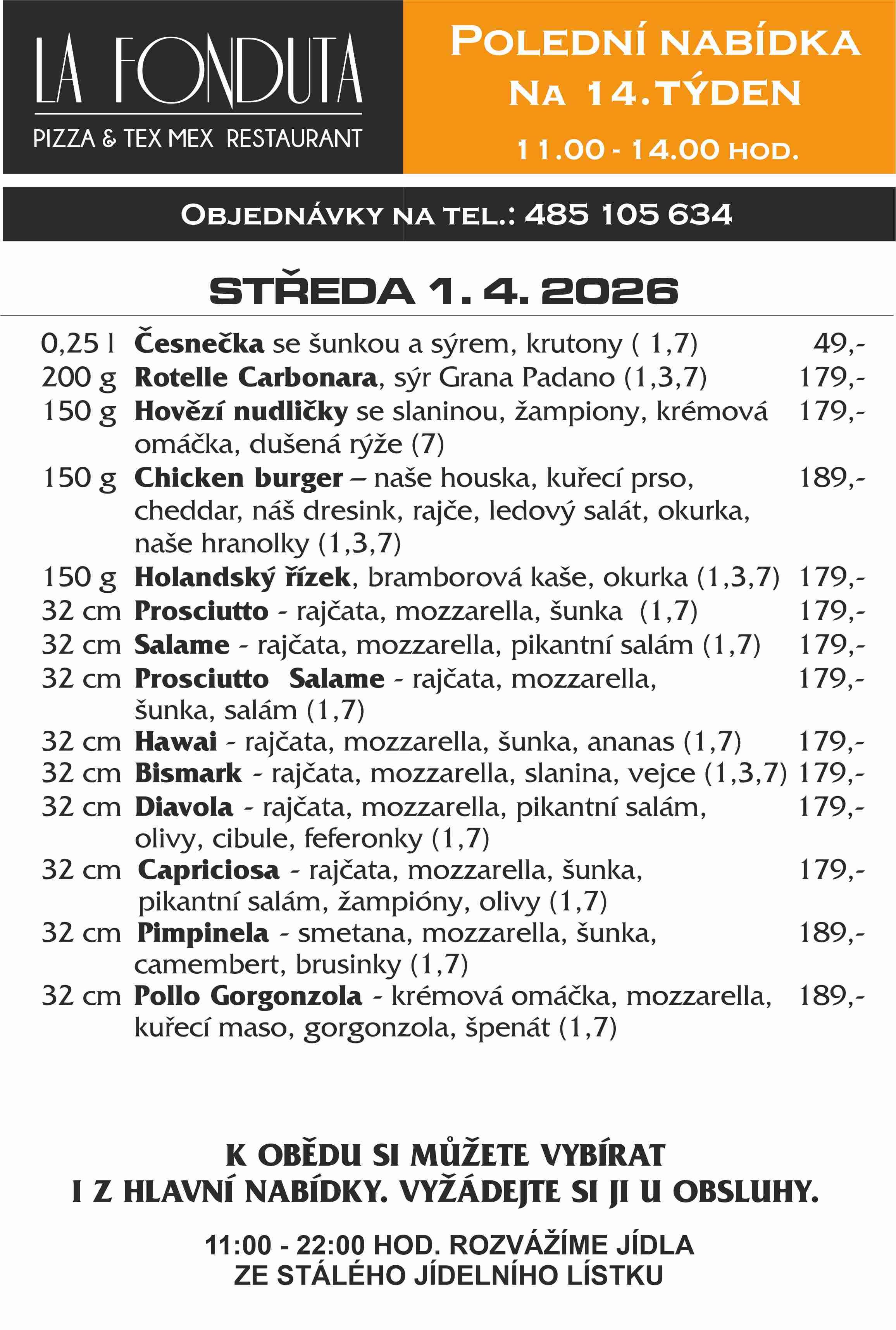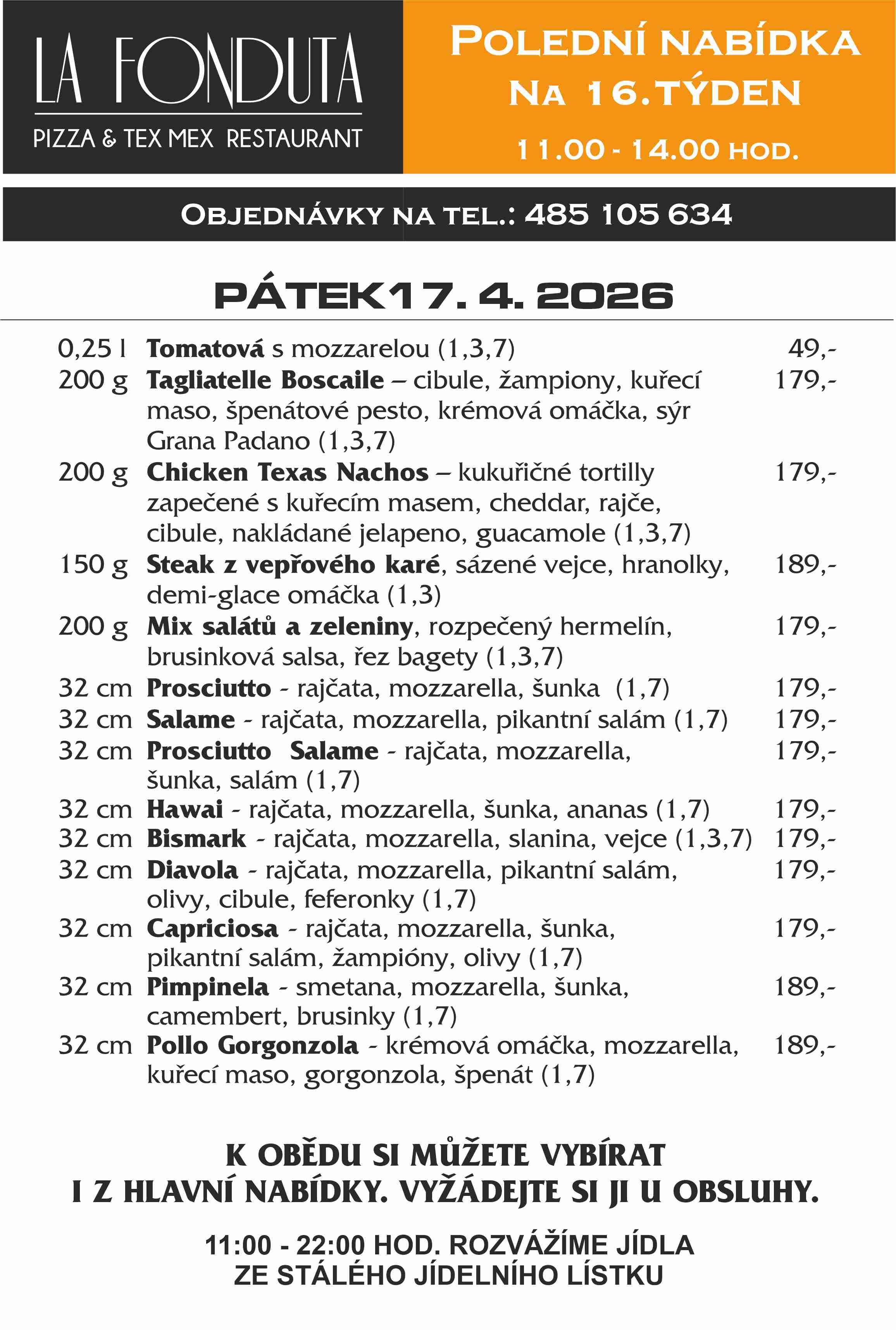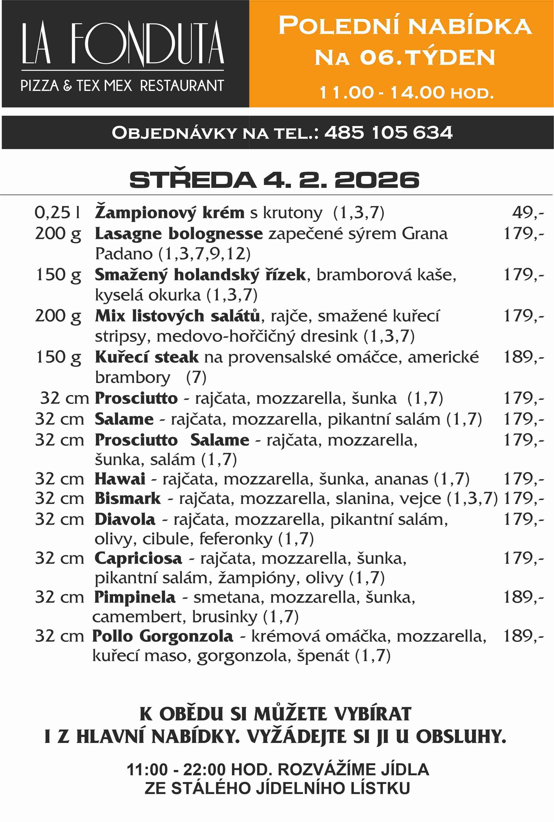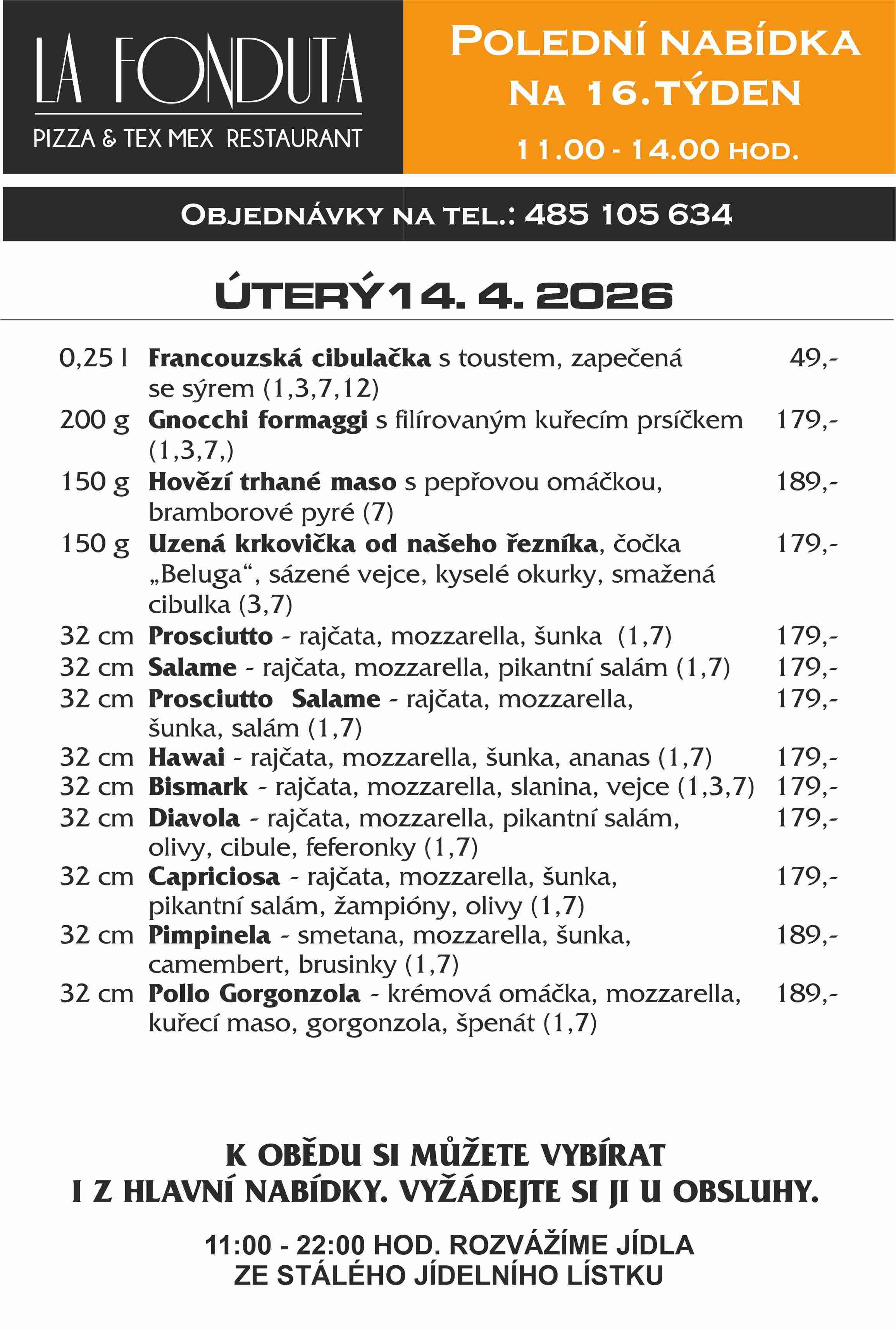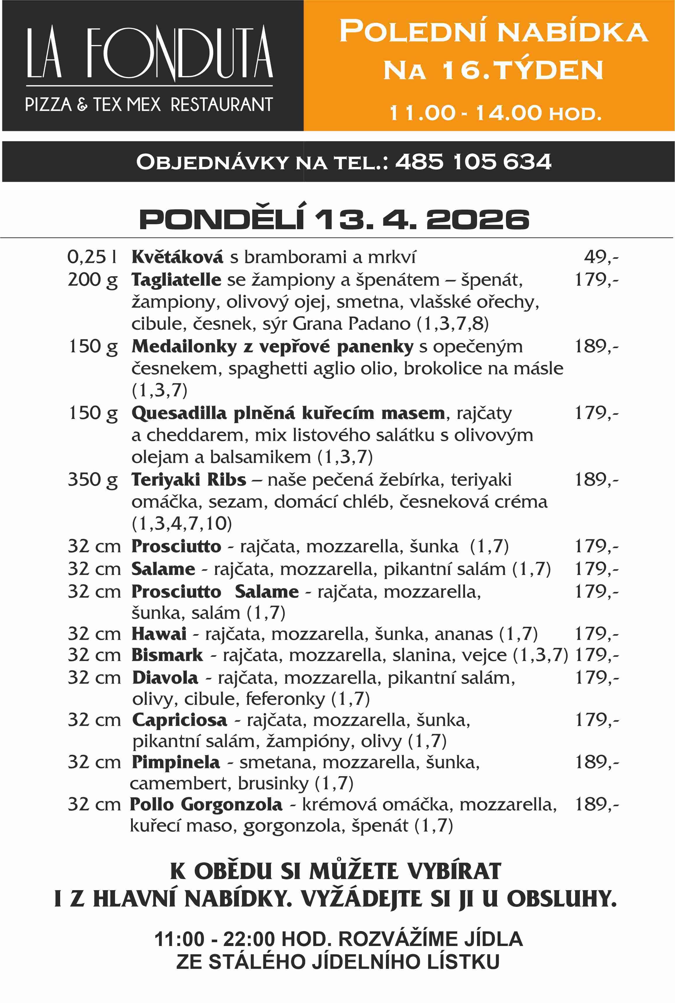 Doba oběda přináší polední nabídku, kde můžete ochutnat jídla z české, italské ale třeba i pokrmy mexické, španělské a americké kuchyně.
