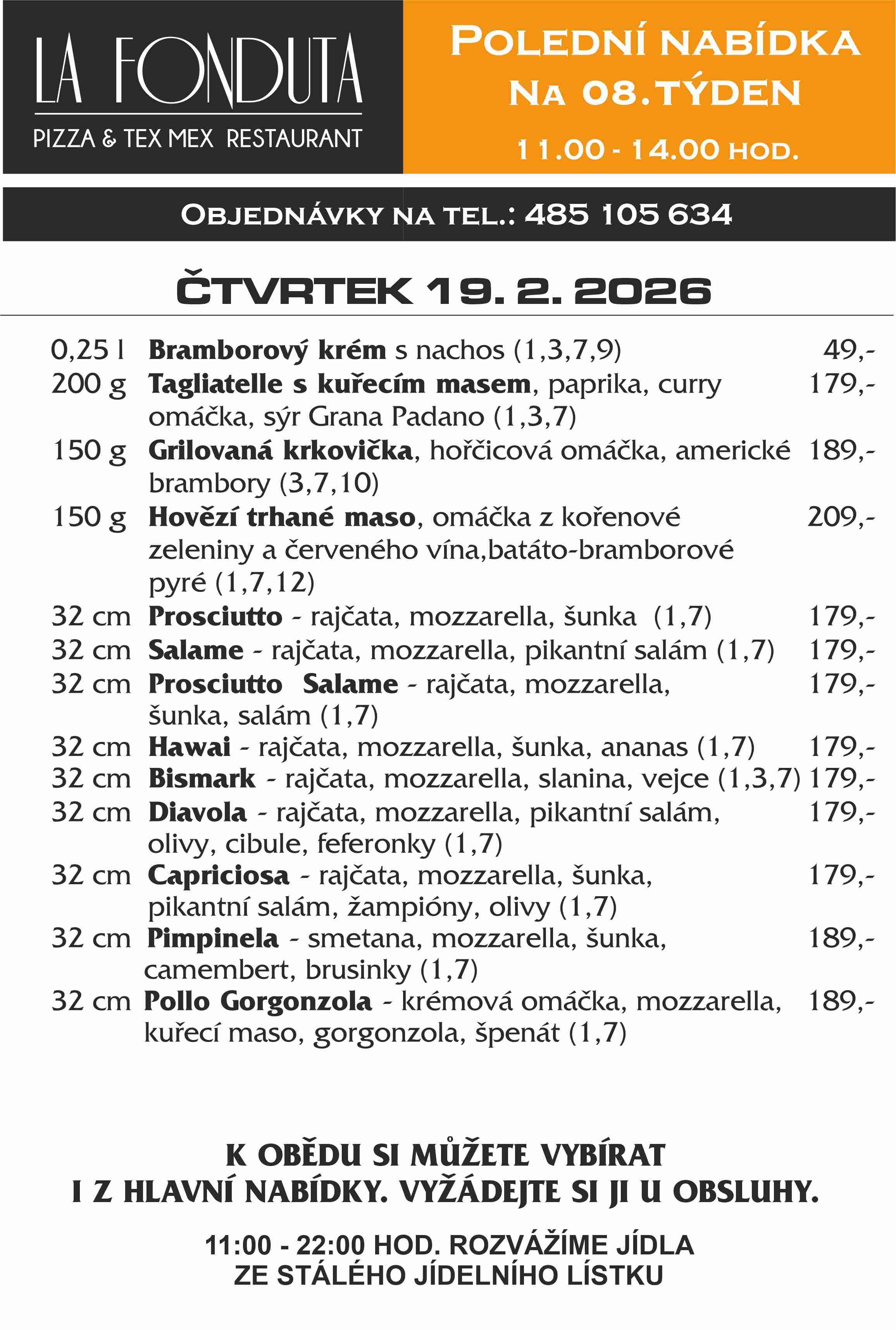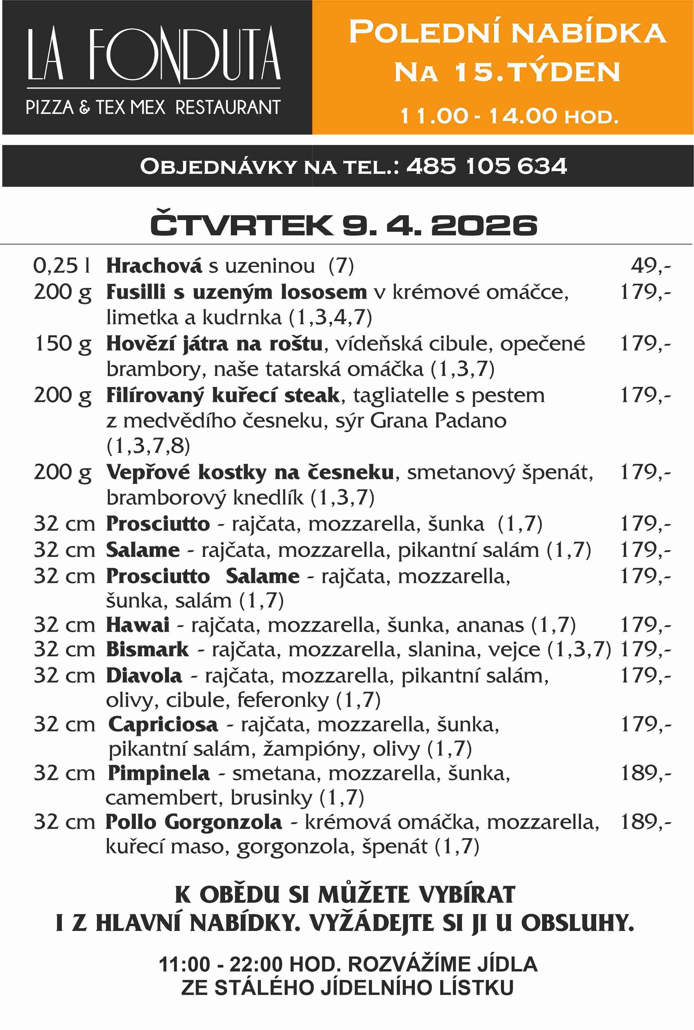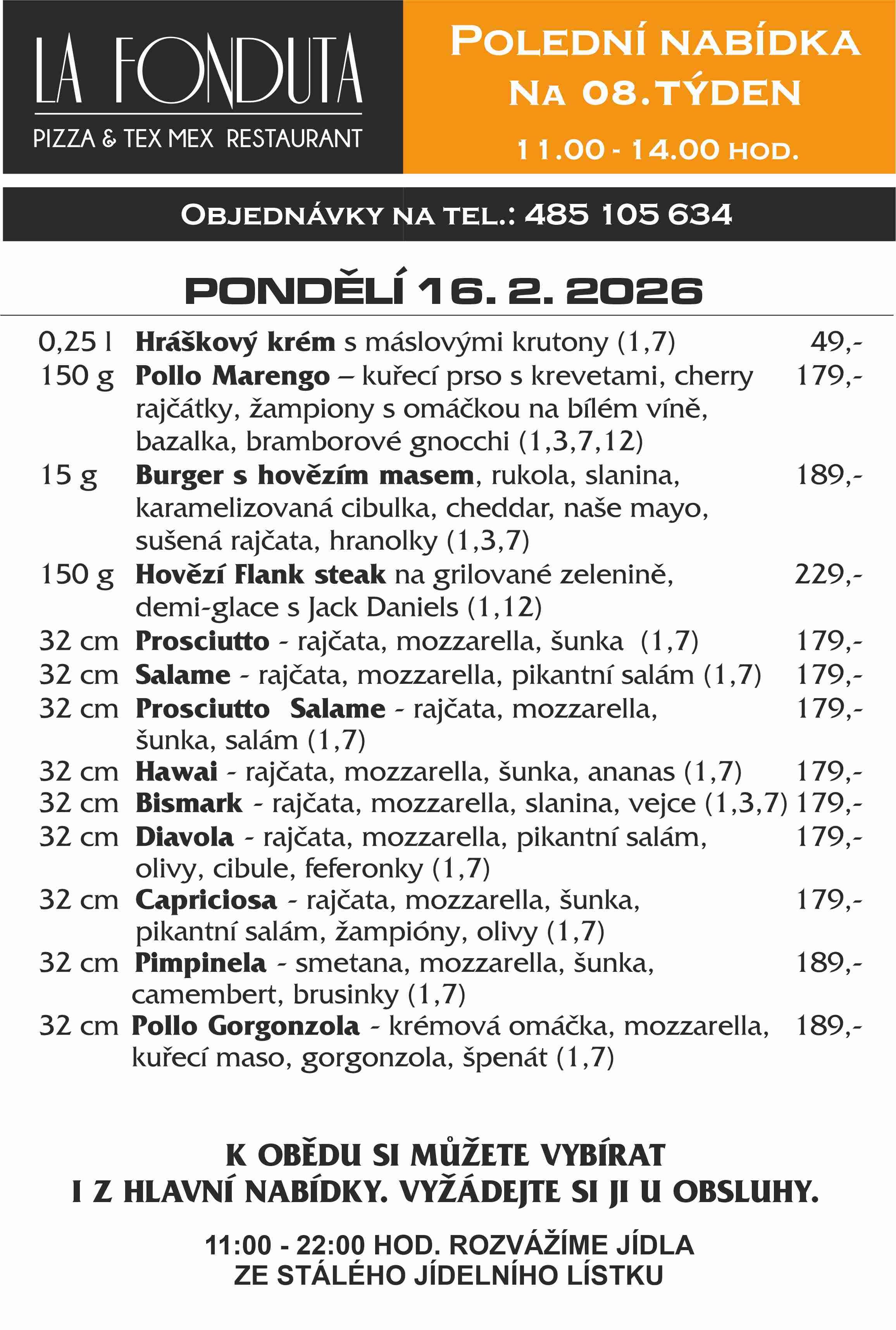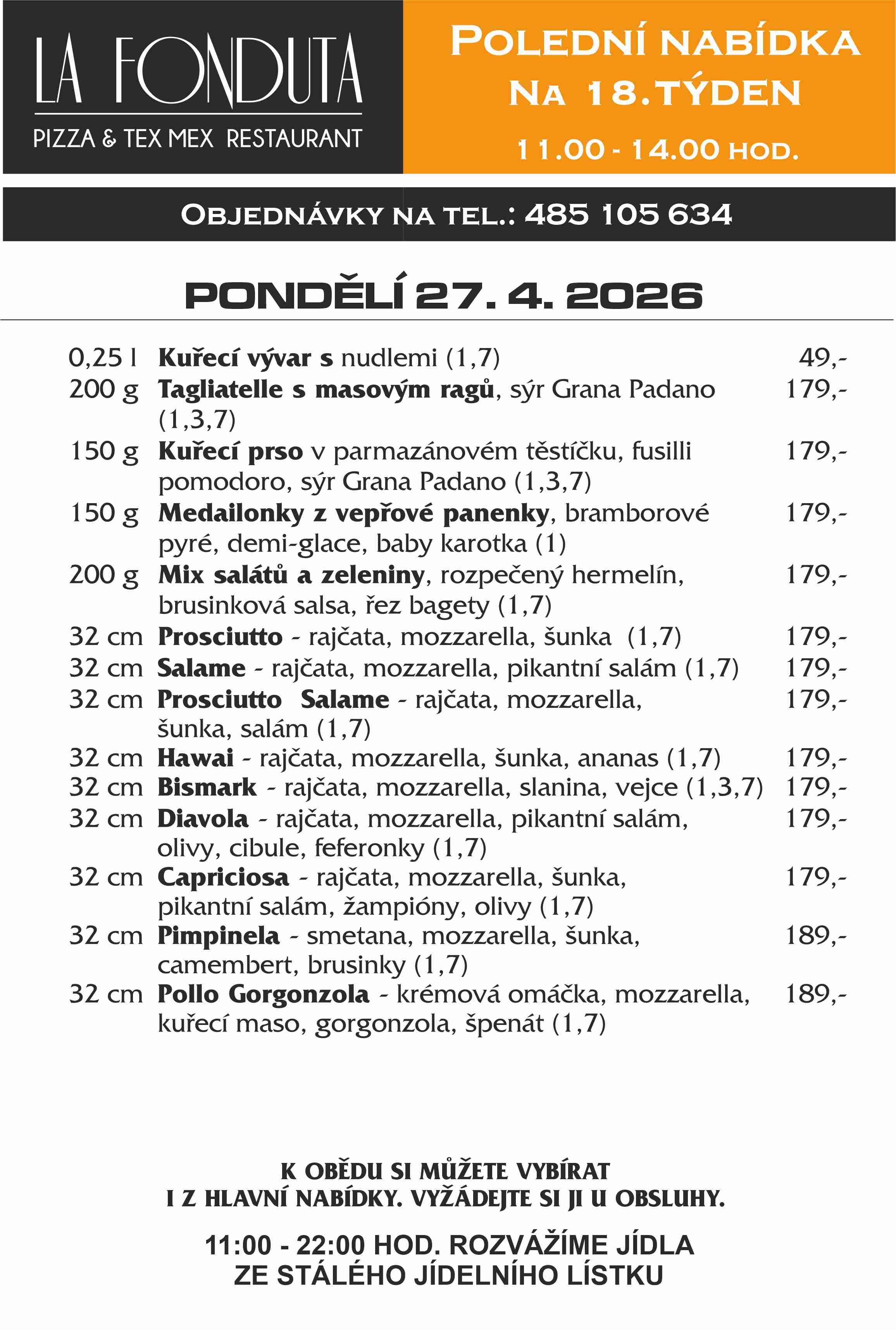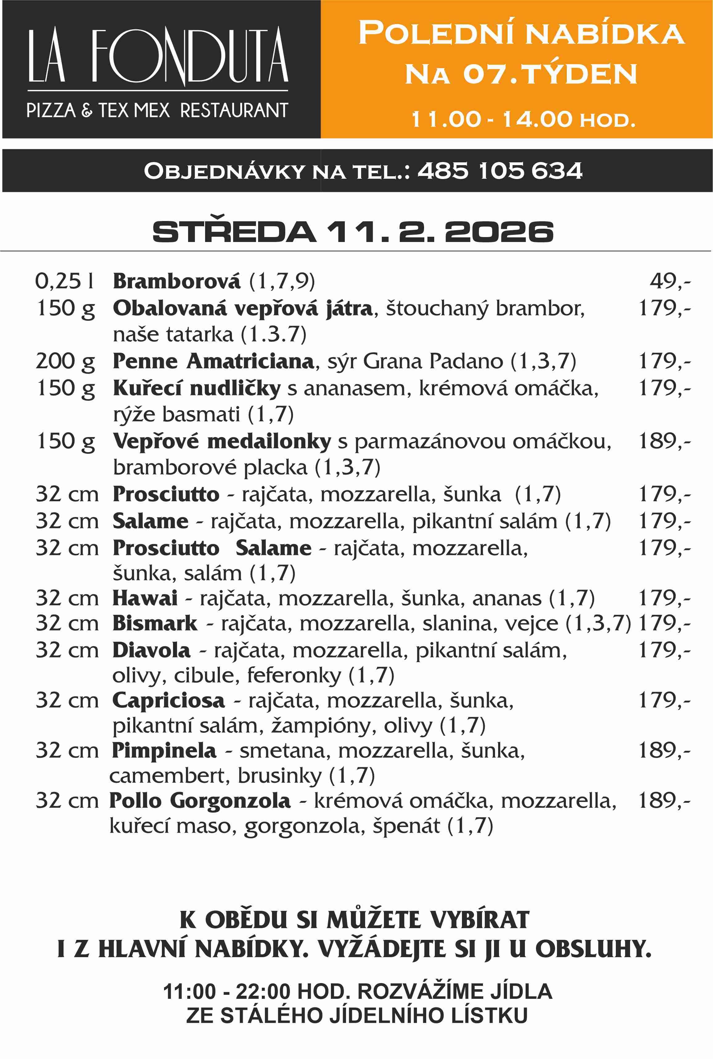 Doba oběda přináší polední nabídku, kde můžete ochutnat jídla z české, italské ale třeba i pokrmy mexické, španělské a americké kuchyně.