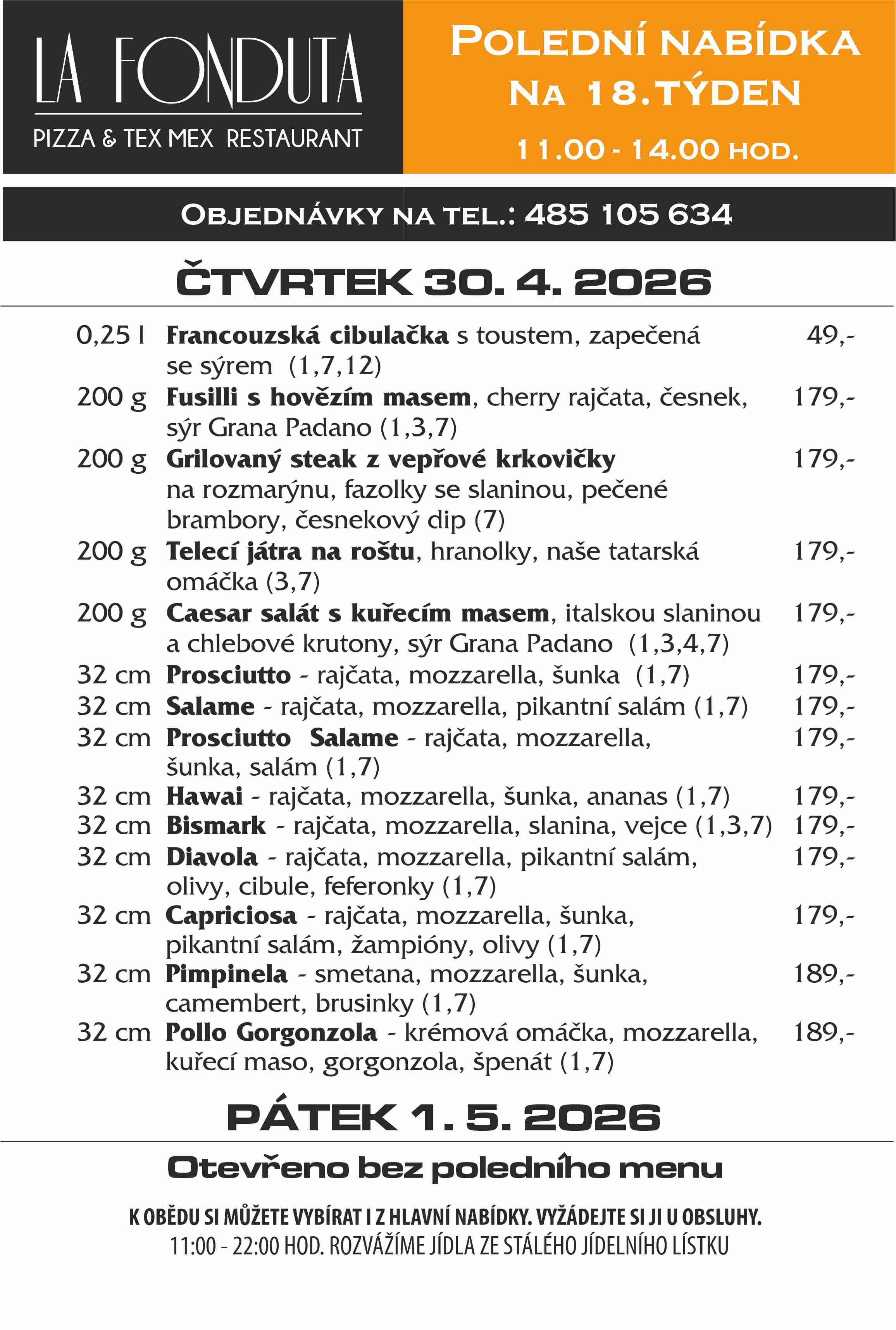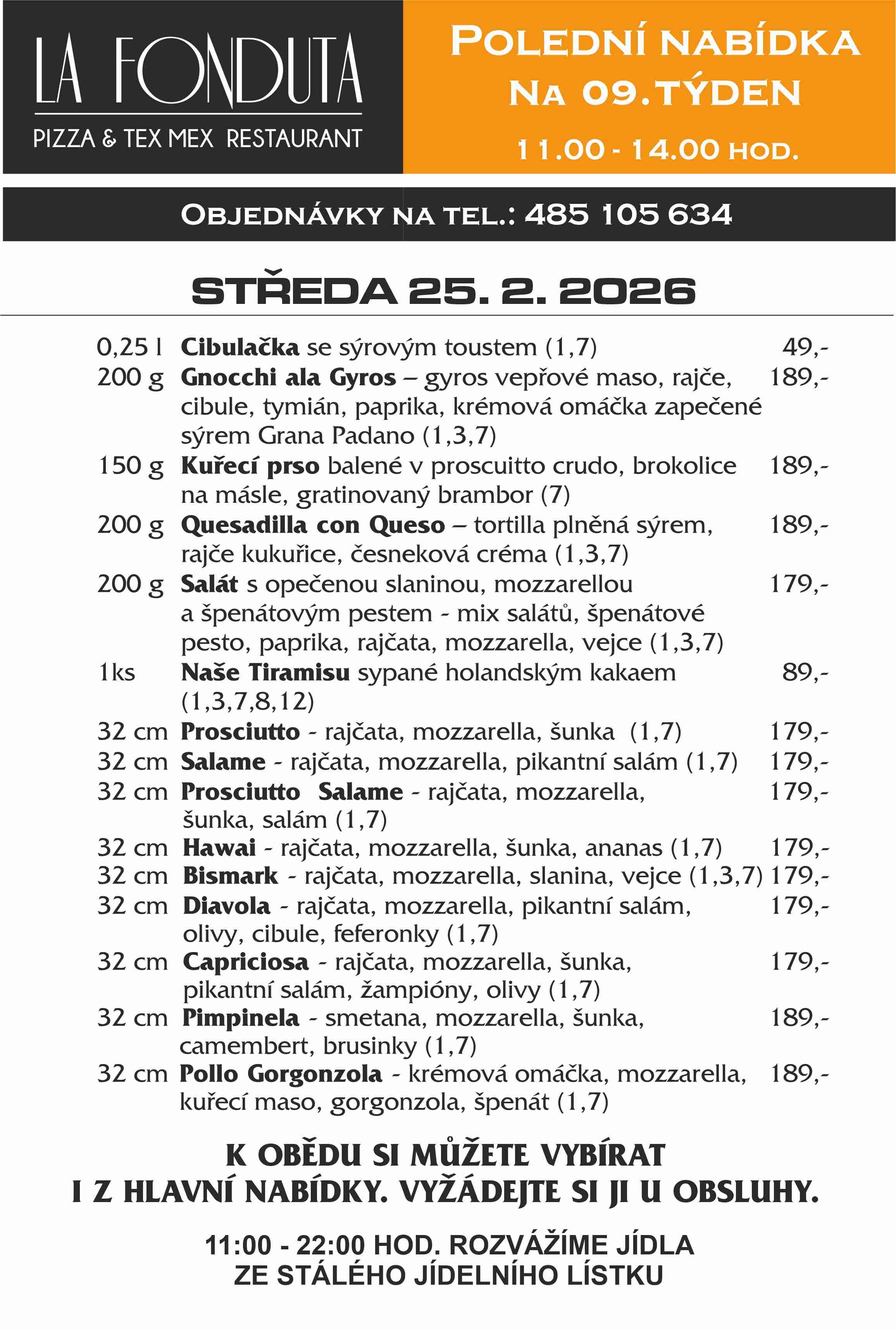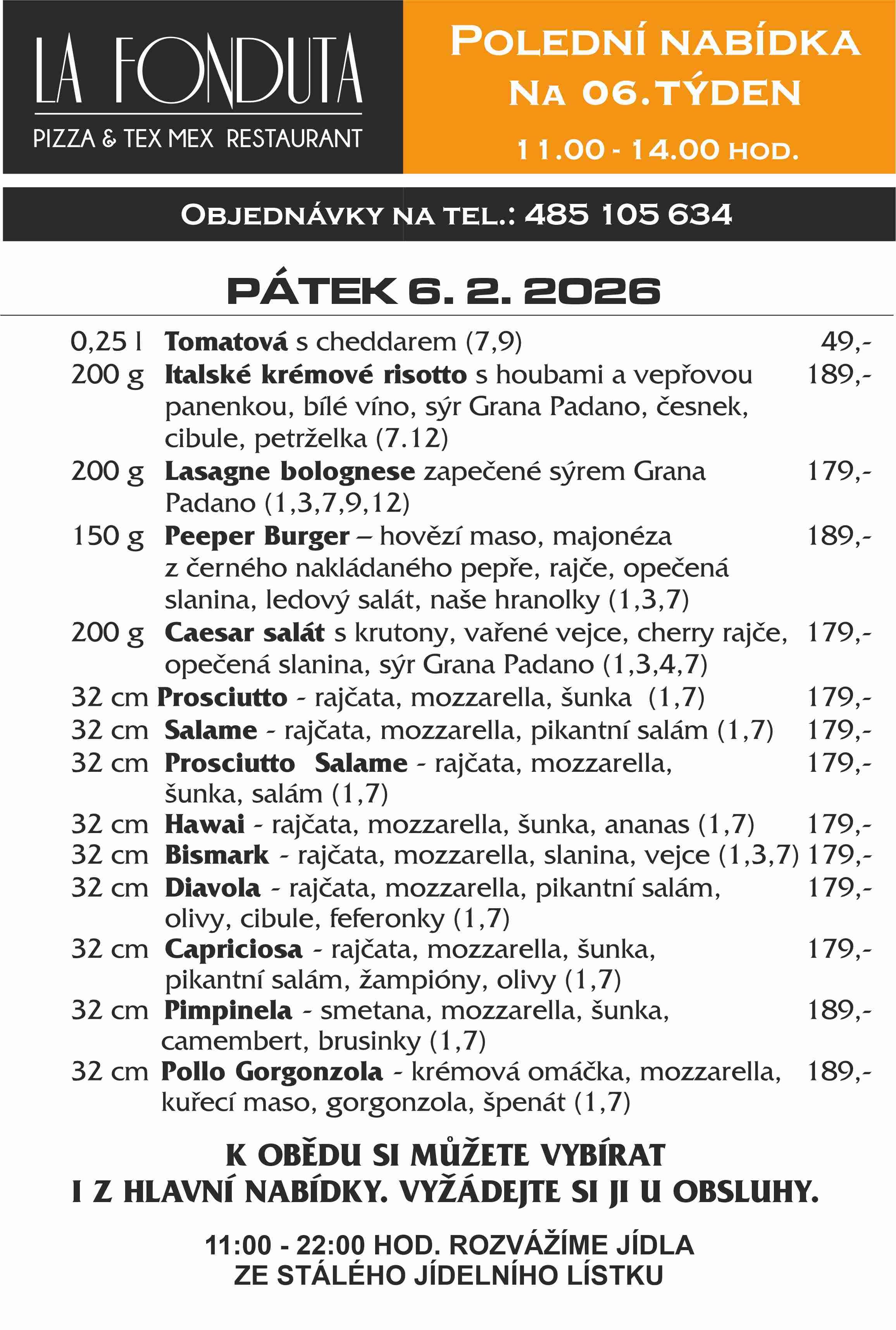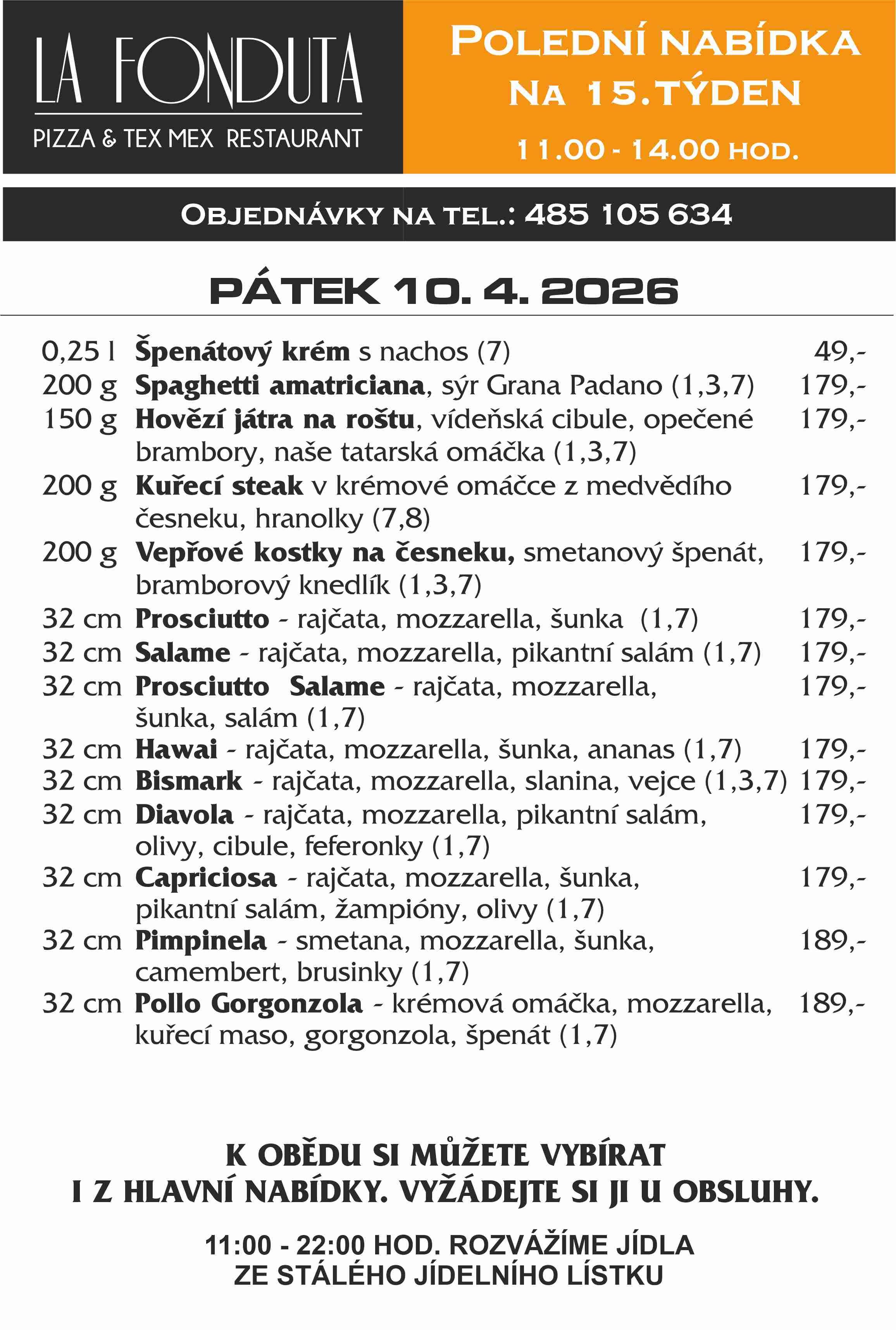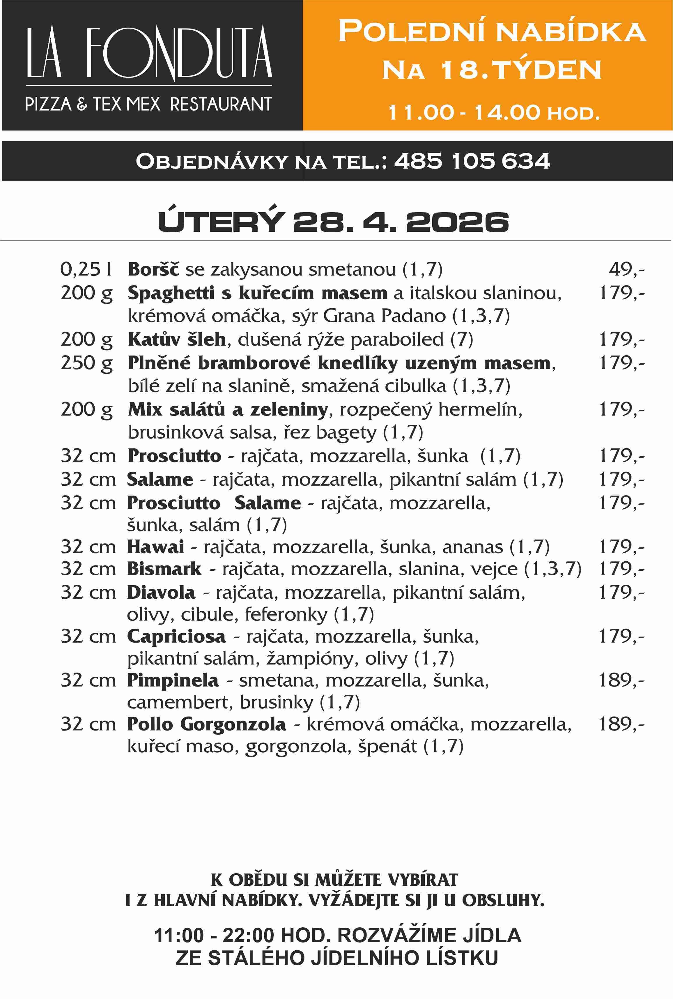 Doba oběda přináší polední nabídku, kde můžete ochutnat jídla z české, italské ale třeba i pokrmy mexické, španělské a americké kuchyně.
