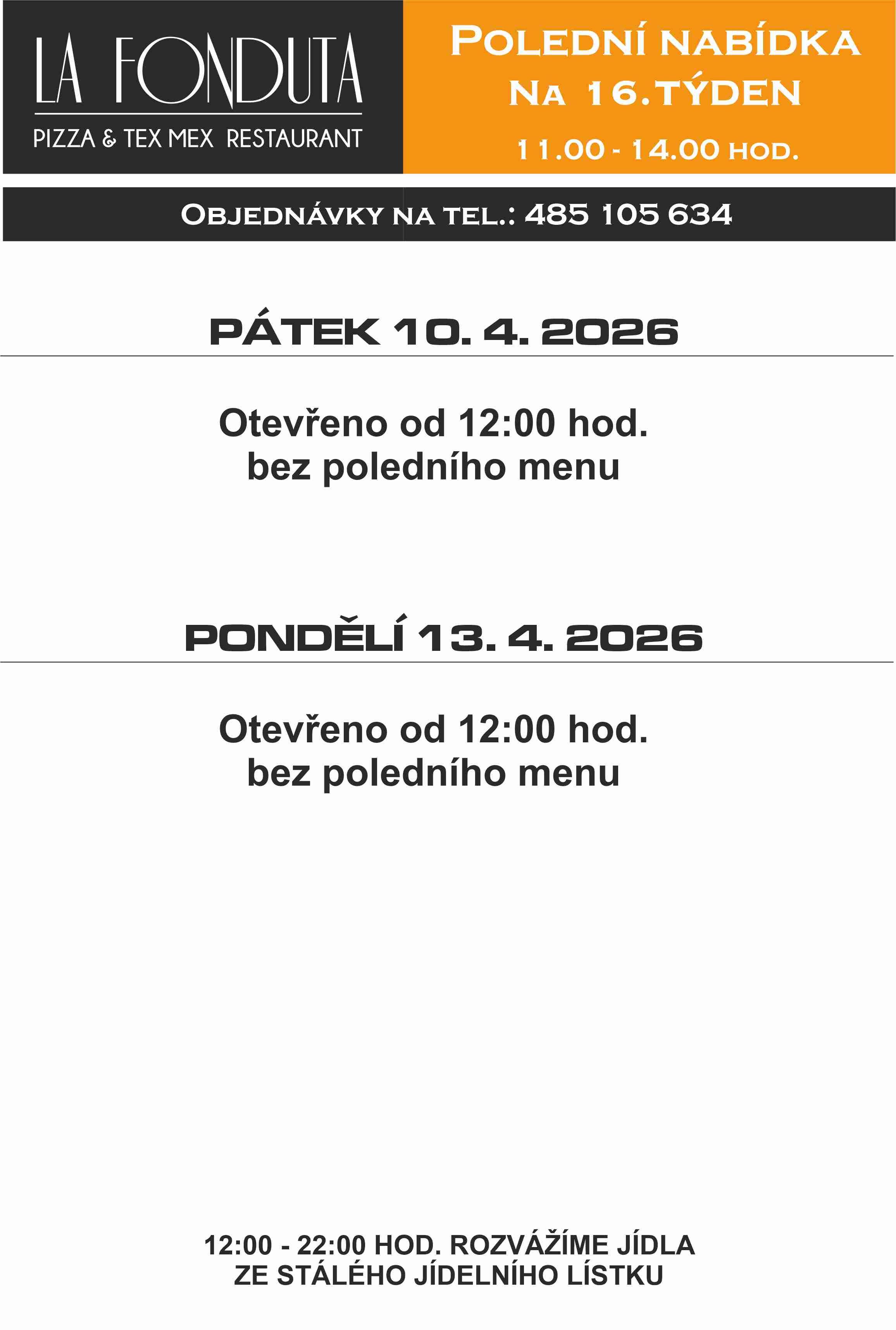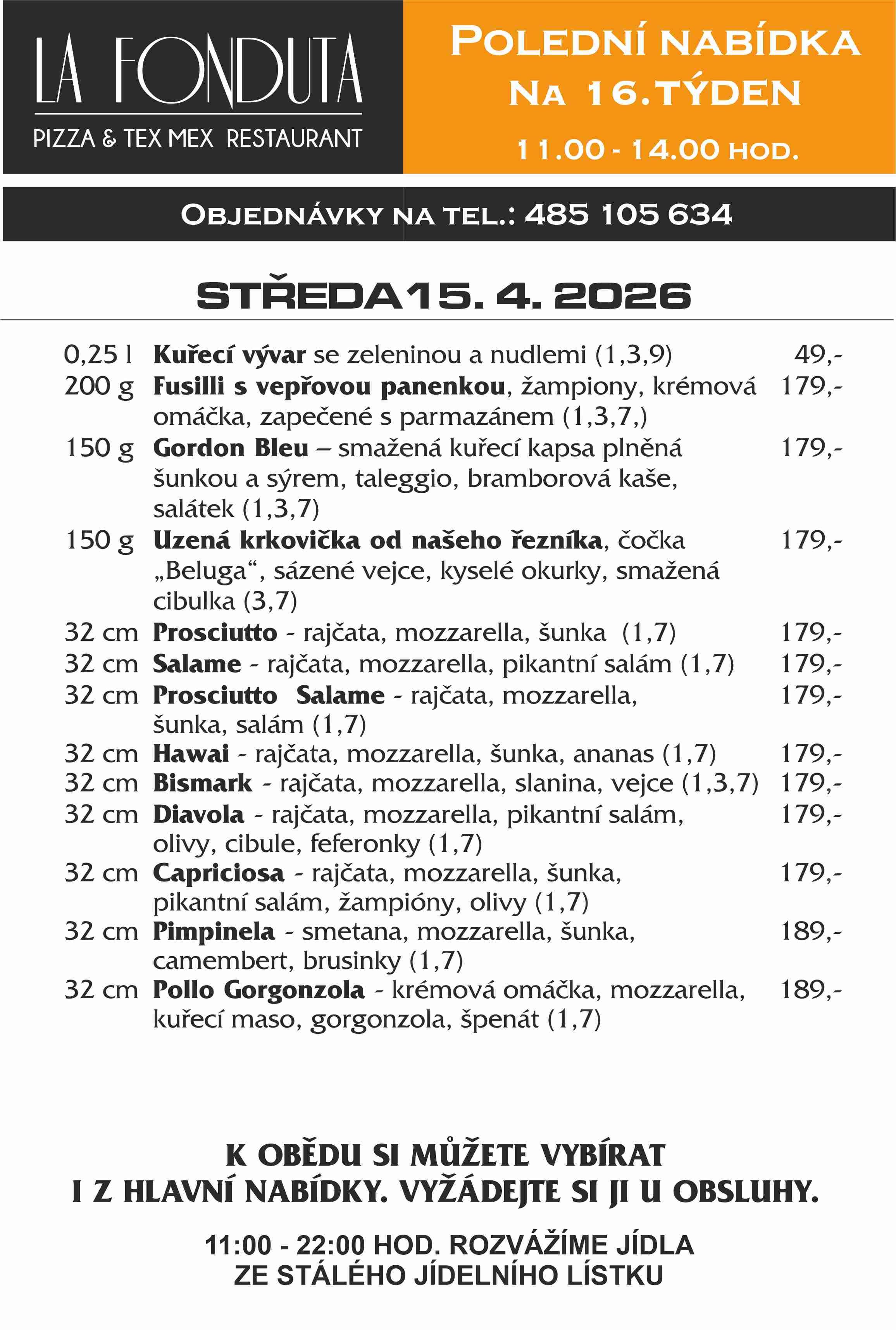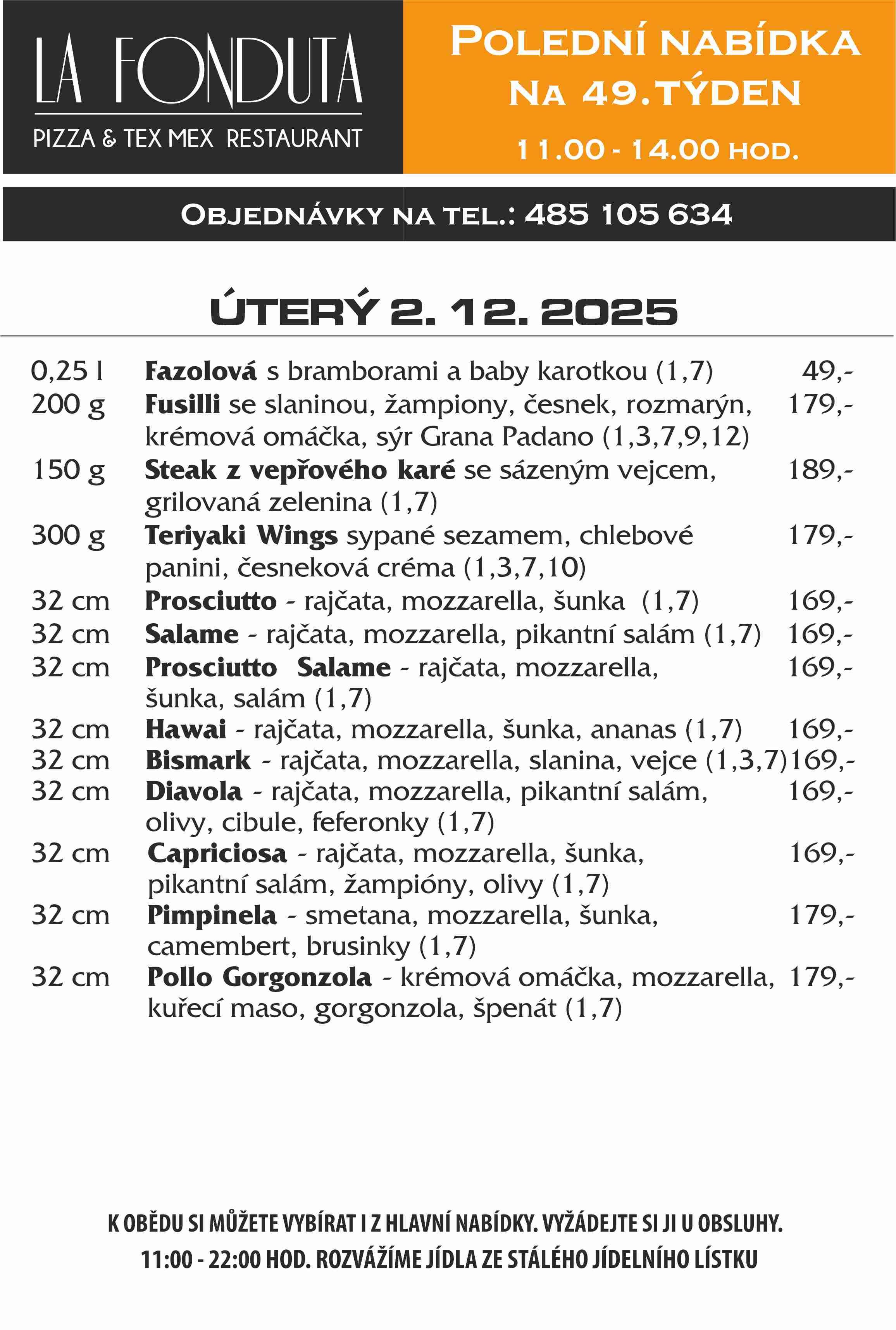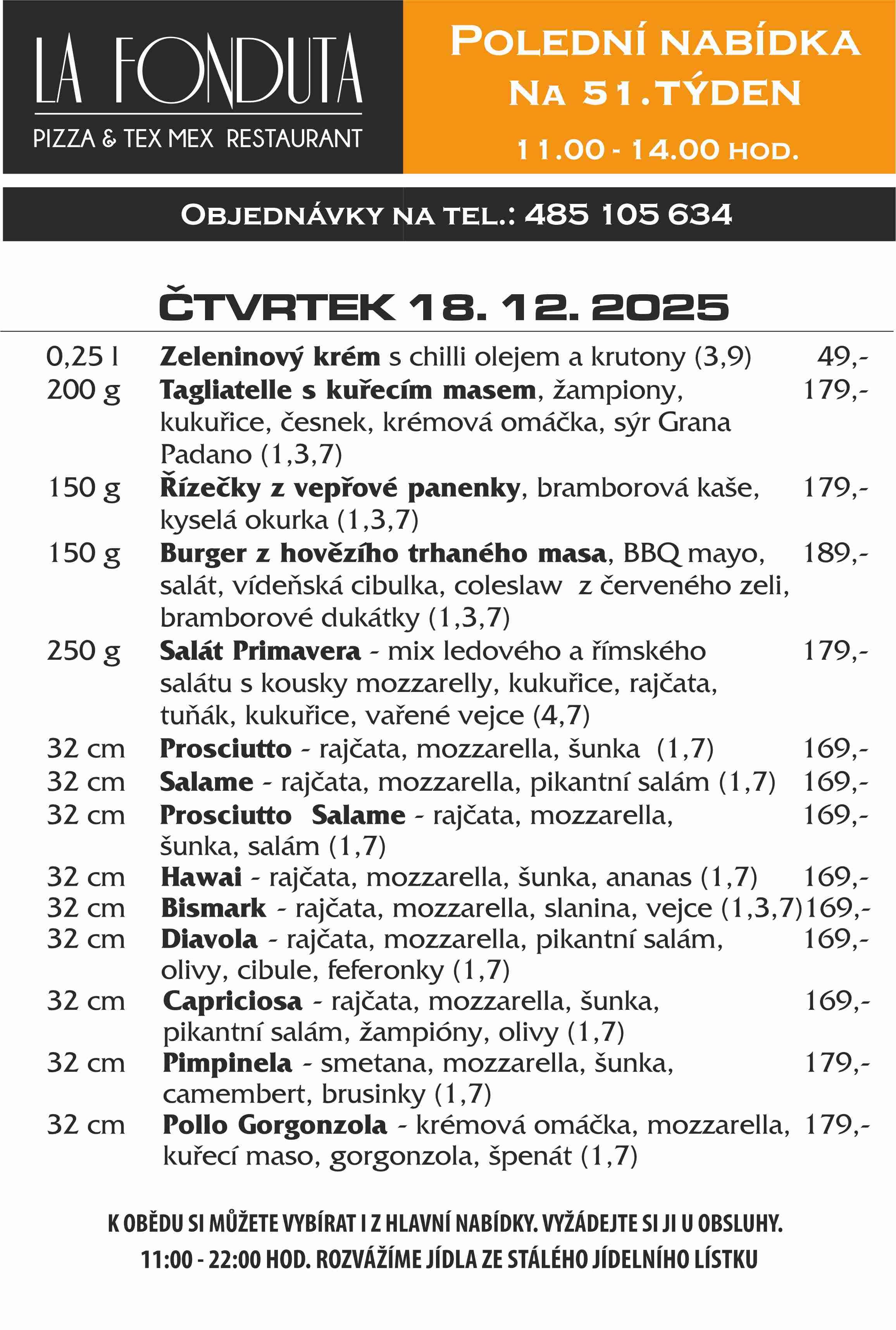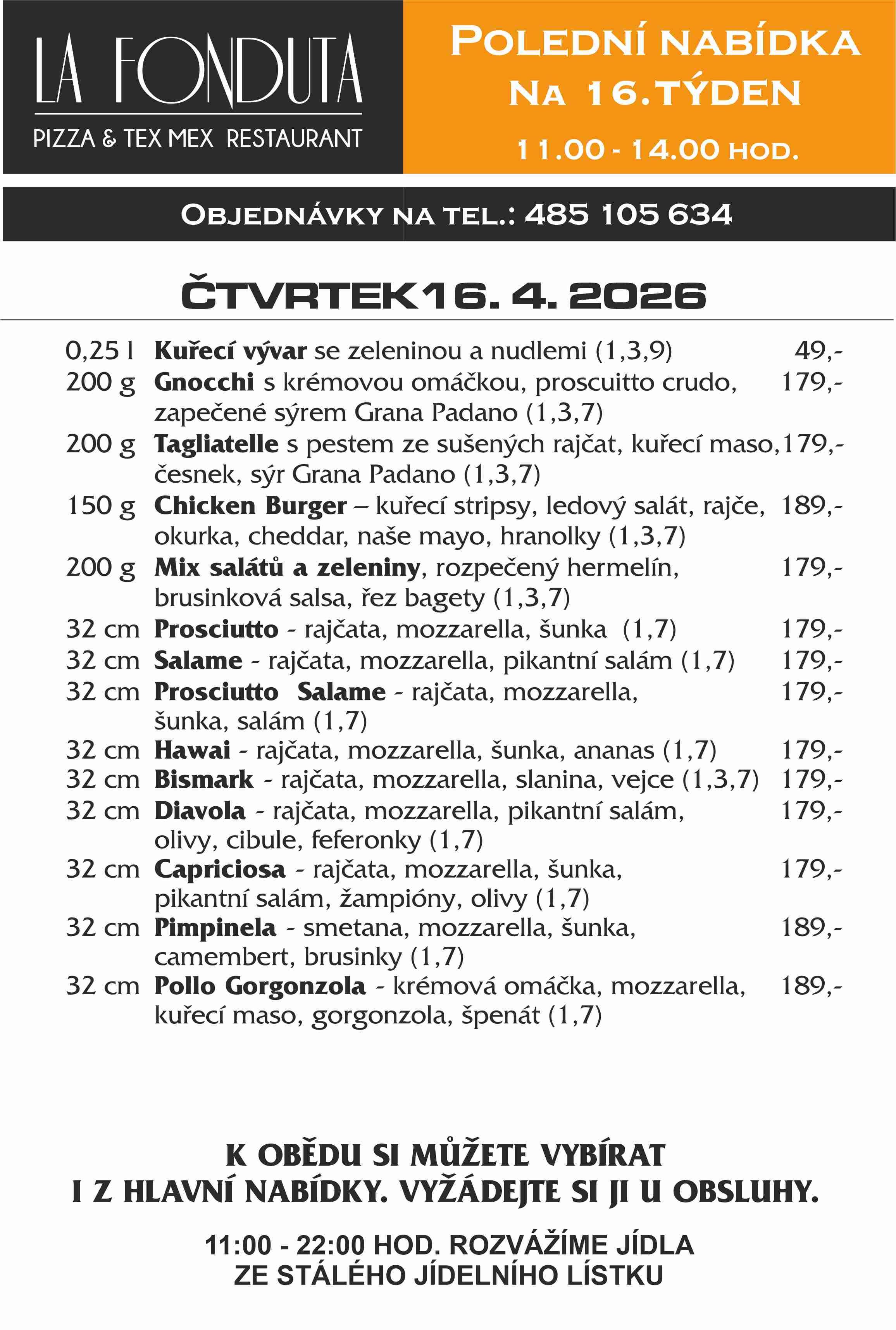 Doba oběda přináší polední nabídku, kde můžete ochutnat jídla z české, italské ale třeba i pokrmy mexické, španělské a americké kuchyně.